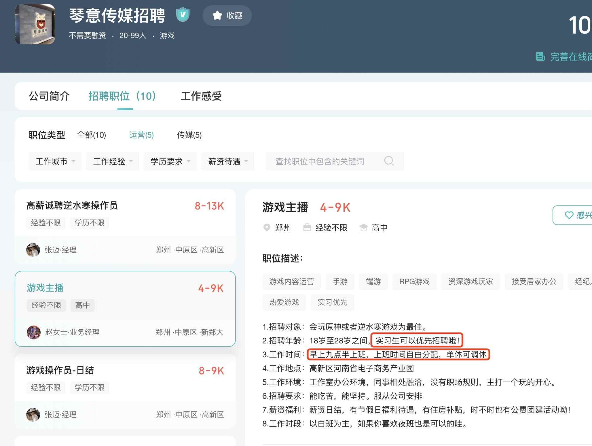在网上搜索该公司,可以看到不少招聘信息。在BOSS直聘网站上,该公司发布了10条招聘信息。其中招聘“游戏主播”的信息显示,薪资4000-9000元、经验不限,要求会玩原神或者逆水寒游戏为最佳,招聘年龄上还注明“实习生可以优先招聘”。在工作时间上,该公司称“早上九点半上班,上班时间自由分配,以白班为主……”
