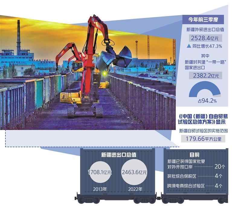 在新疆,20个对外开放口岸构建起了东联西出的“黄金通道”,经由这些通道,新疆已与181个国家和地区产生贸易往来,获批4个综合保税区、4个跨境电商综合试验区。据乌鲁木齐海关统计数字显示,从2013年到2022年,新疆进出口总值从1708.1亿元增长到2463.6亿元。今年前三季度,新疆外贸进出口总值为2528.4亿元,同比增长47.3%,这是新疆外贸进出口总值首次突破2500亿元大关。其中,对共建“一带一路”国家进出口2382.2亿元,增长49.7%,占比达到94.2%。