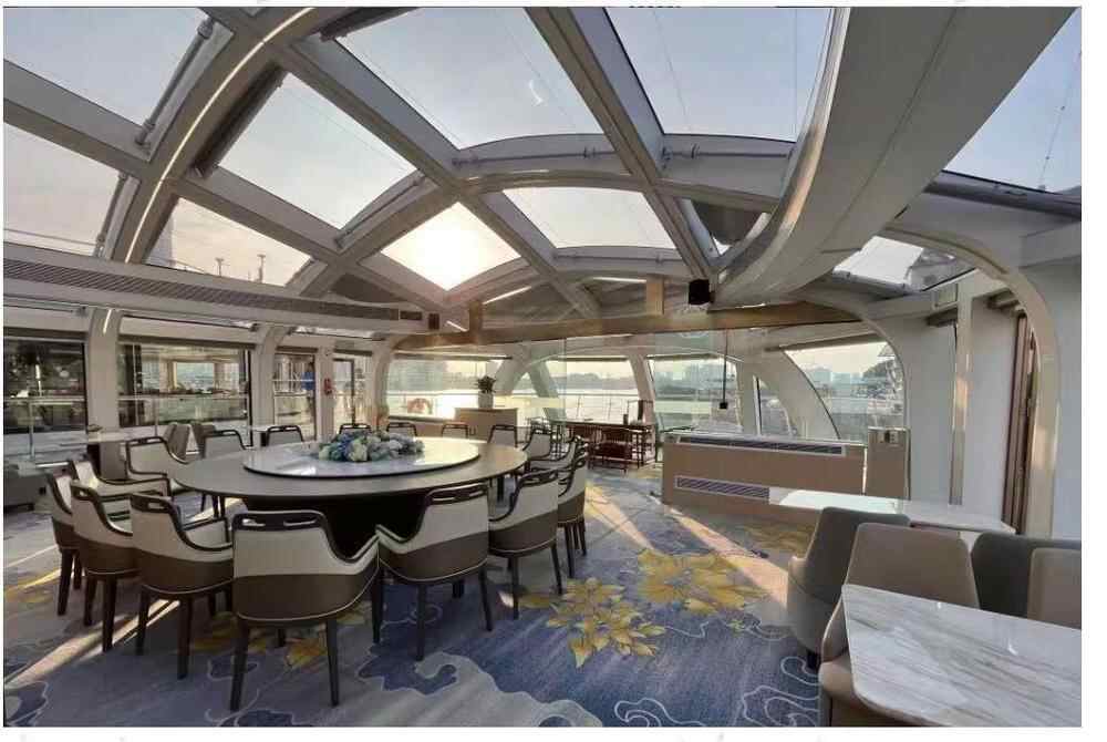 据介绍,“远海启航”号总长49.30米、型宽13.50米,最大客容量为350客位,具备观光游览、接待、商务、庆典等综合功能。“远海启航”号采用锂电池动力,可实现“零排放、低噪音、无污染”航行,游客置身于游船内,将与“绿色”同行,时刻拥有静谧、平稳、舒适的航行体验。游船整体设计融合海丝文化和海洋元素,采用大面积玻璃结构,船内透亮、视野开阔、空间灵动。游客身处其中,便能轻松欣赏珠江美景。