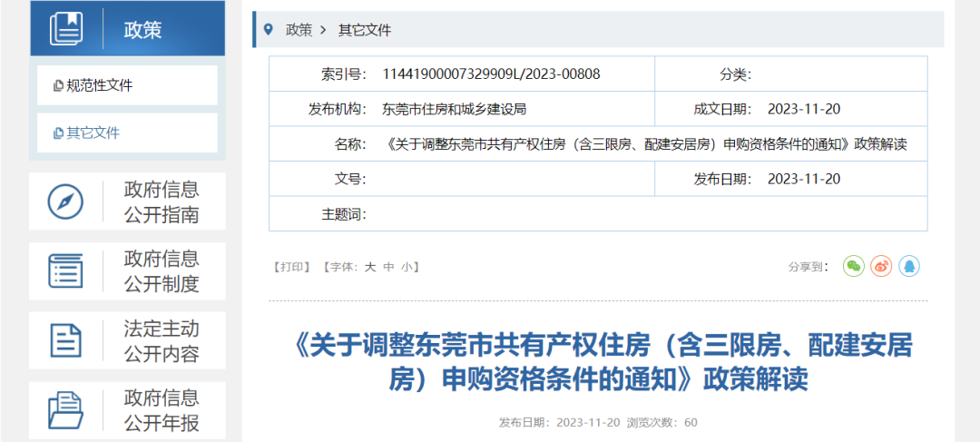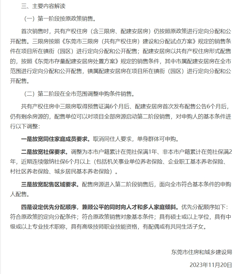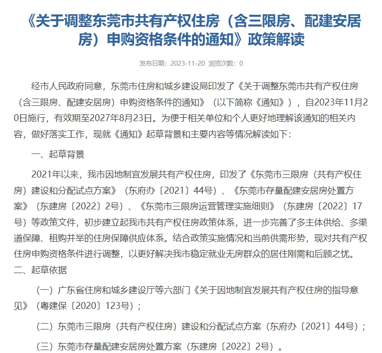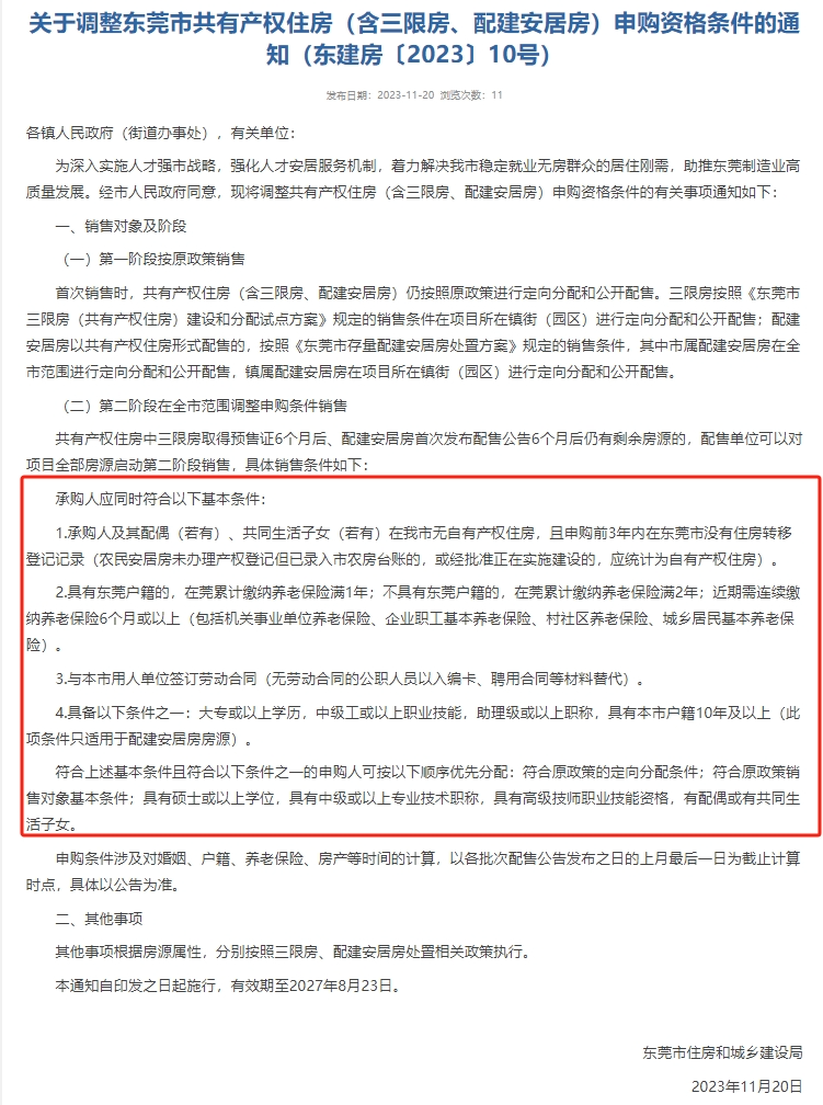 11月20日,东莞市住建局发布了《关于调整东莞市共有产权住房(含三限房、配建安居房)申购资格条件的通知》(东建房〔2023〕10号)。