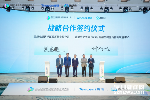 2023年深圳企业创新发展大会人工智能创新应用论坛上,腾讯分别与香港中文大学(深圳)福田生物医药创新研发中心、深圳市新国都数字科技有限公司、深圳市百家安科技有限公司、深圳百泰投资控股集团有限公司、深圳市旭通智能有限公司、深圳市启明智显科技有限公司等签署战略合作框架协议,未来将共同携手推进人工智能等前沿技术深入产业发展全链条。