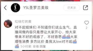 对此,“红绿灯的黄”评论区道歉称,“对不起姐妹们,不知道你们这么生气,直播间做内容只是想让大家开心,给大家带来不好的观感了,不好意思。大家理性消费,多方比价,是我太low对不起。”