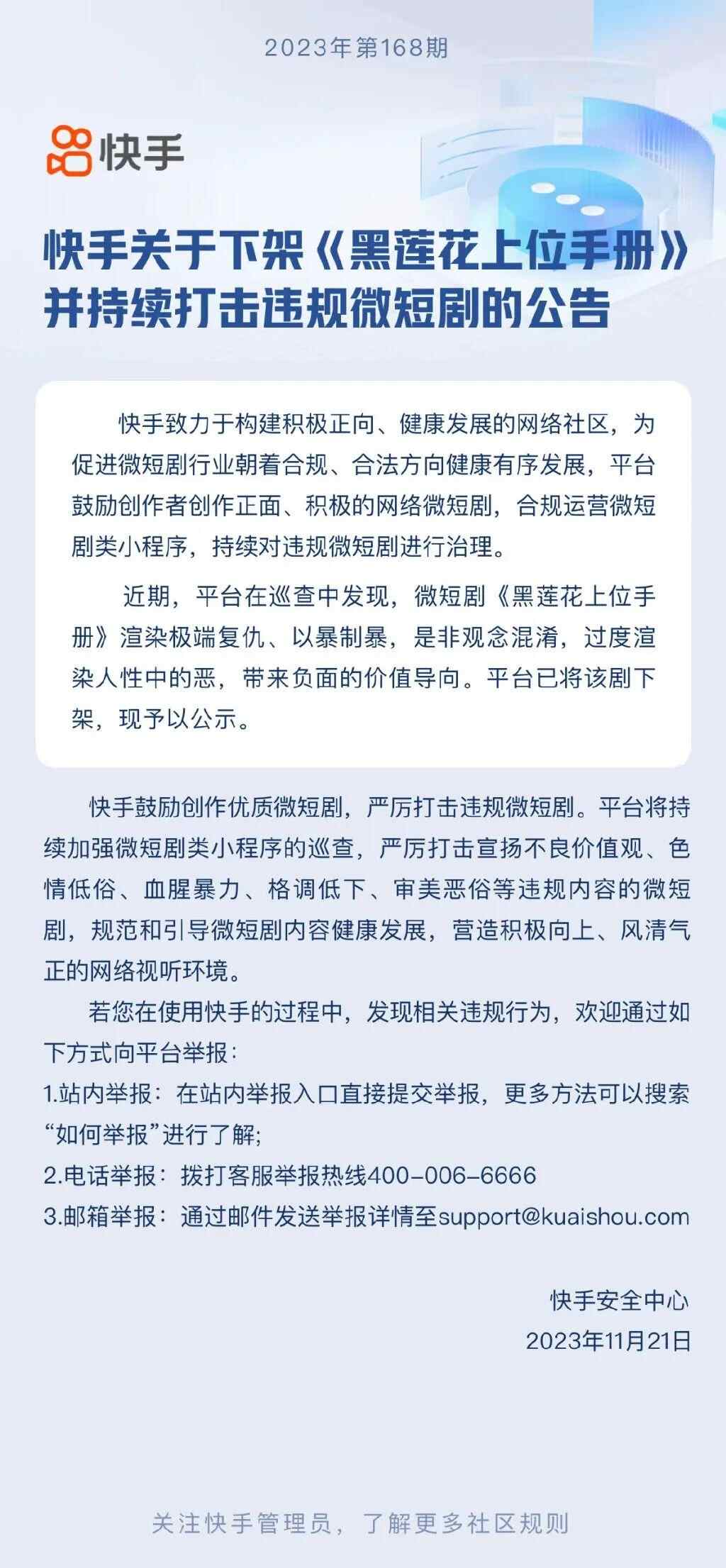 同日,快手安全中心也发布公告称,近期,平台在巡查中发现,微短剧《黑莲花上位手册》渲染极端复仇、以暴制暴,是非观念混淆,过度渲染人性中的恶,带来负面的价值导向。平台已将该剧下架,现予以公示。