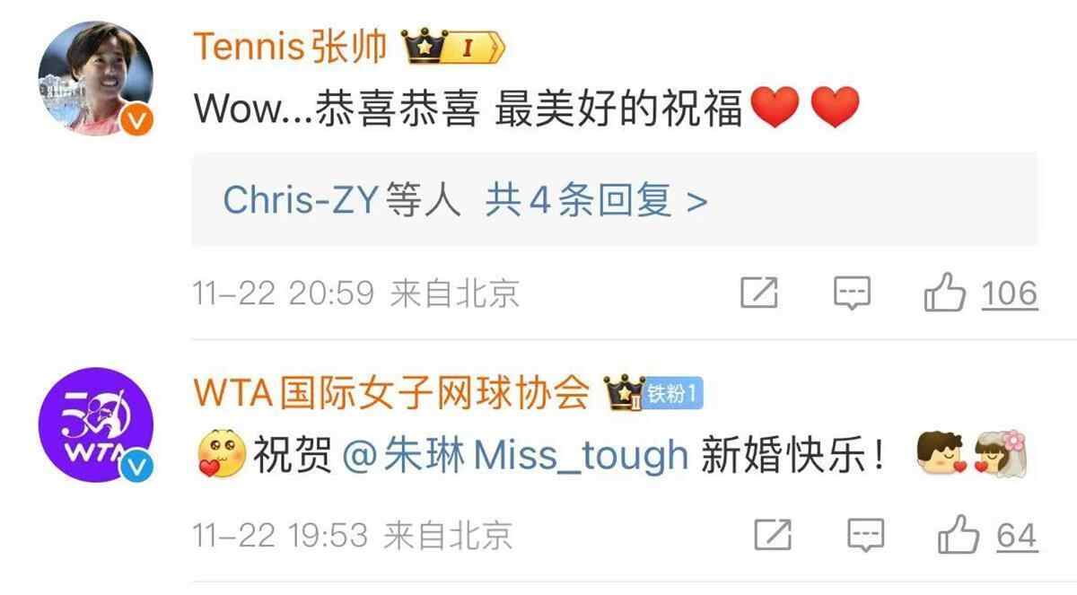 这一消息也引来大量祝福,WTA国际女子网球协会和中国女子网球选手张帅,都在评论区送上祝福。