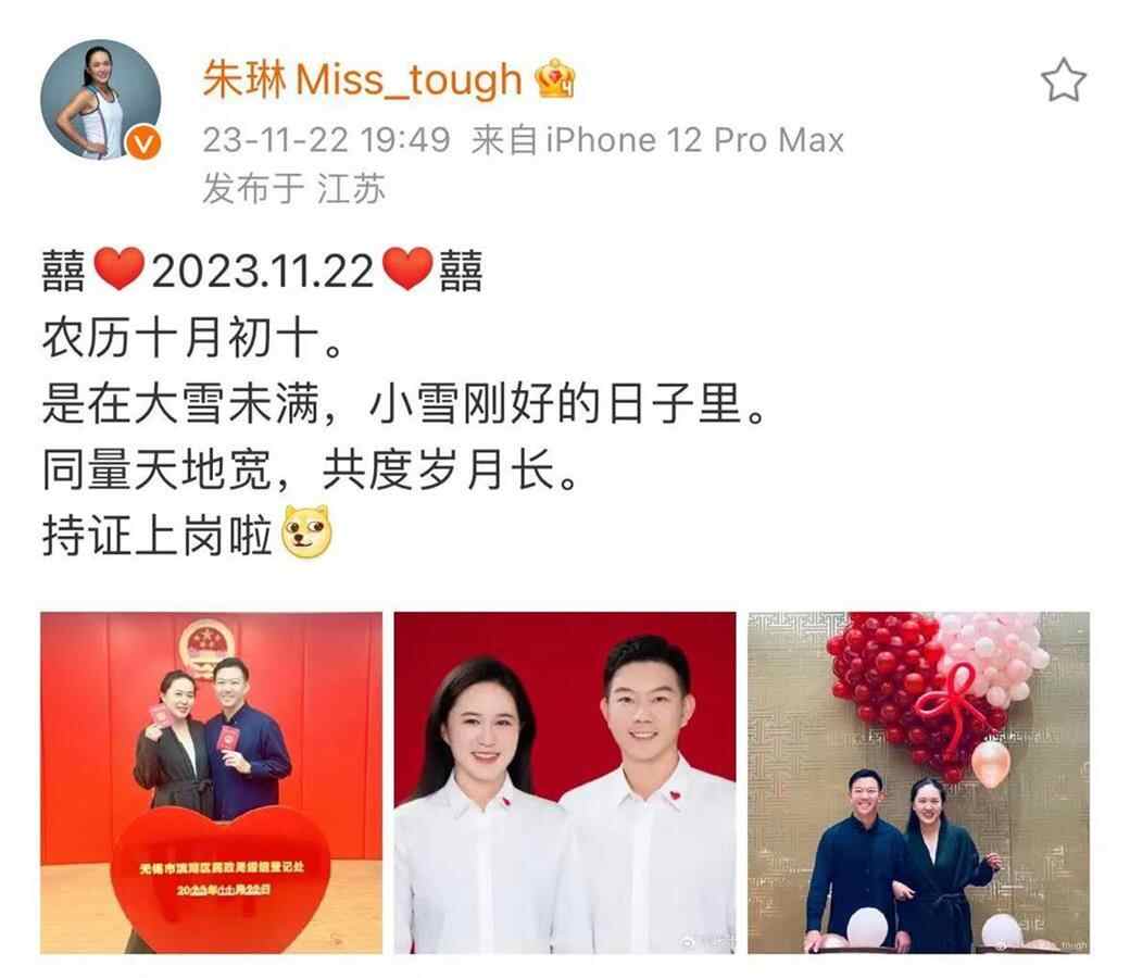 11月22日19时49分,中国网球女选手朱琳,在自己的社交平台上官宣领证结婚。