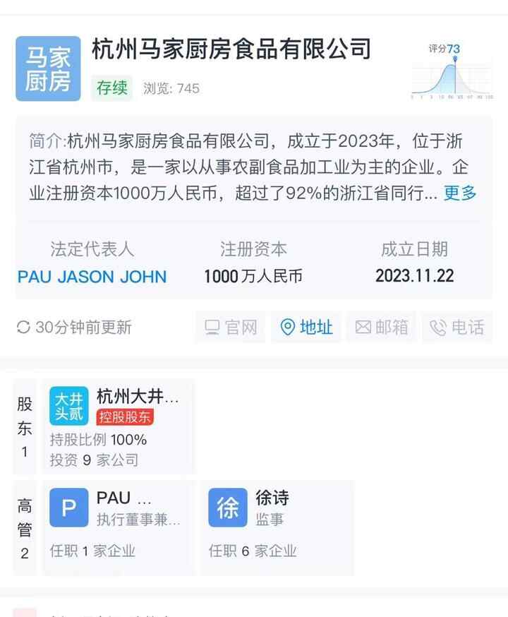 11月22日,国家企业信用信息公示系统里多了一家公司:杭州马家厨房食品有限公司。