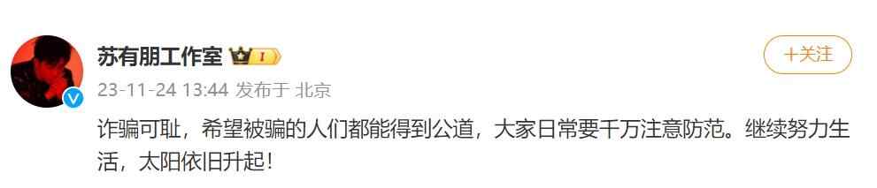 11月24日,苏有朋工作室发文回应“苏有朋被金融诈骗”:诈骗可耻,希望被骗的人们都能得到公道,大家日常要千万注意防范。继续努力生活,太阳依旧升起!