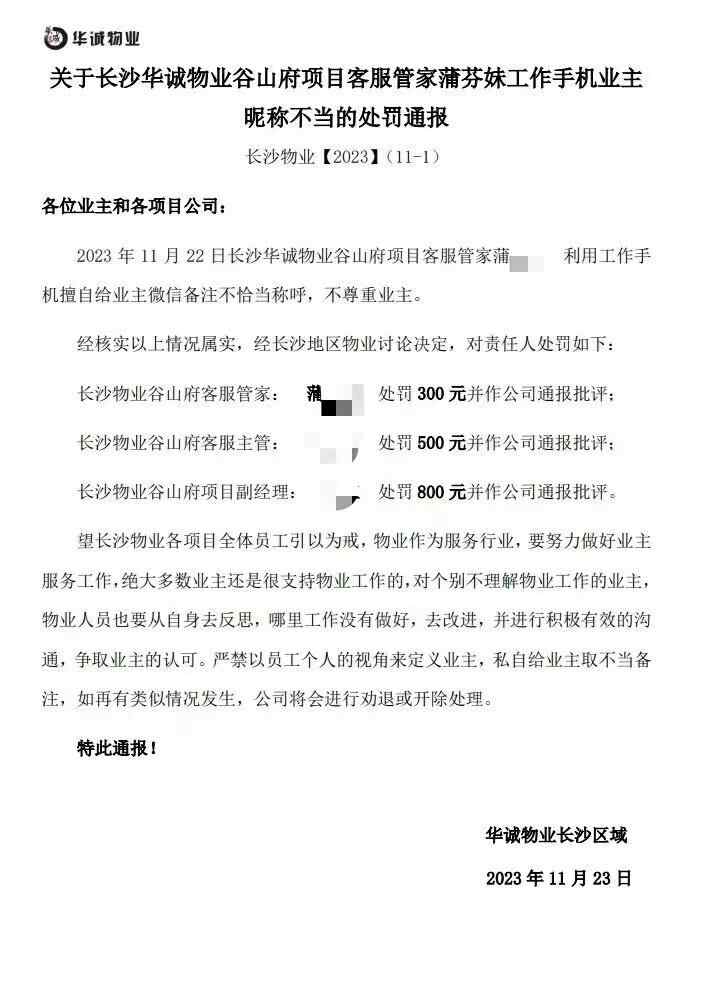 在处罚通报中写着:“11月22日,长沙华诚物业谷山府项目客服管家蒲某某利用工作手机擅自给业主微信备注不恰当称呼,不尊重业主。经核实,以上情况属实。经长沙地区物业讨论决定,对责任人处罚如下:长沙物业谷山府客服管家、客服主管、项目副经理分别处以300、500、800元,并作公司通报批评。”