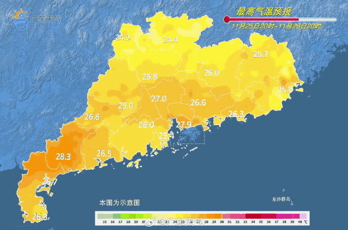26日,广东大部晴间少云。最低气温:粤北的北部市县9℃~13℃,南部沿海市县17℃~20℃,其余市县14℃~17℃。