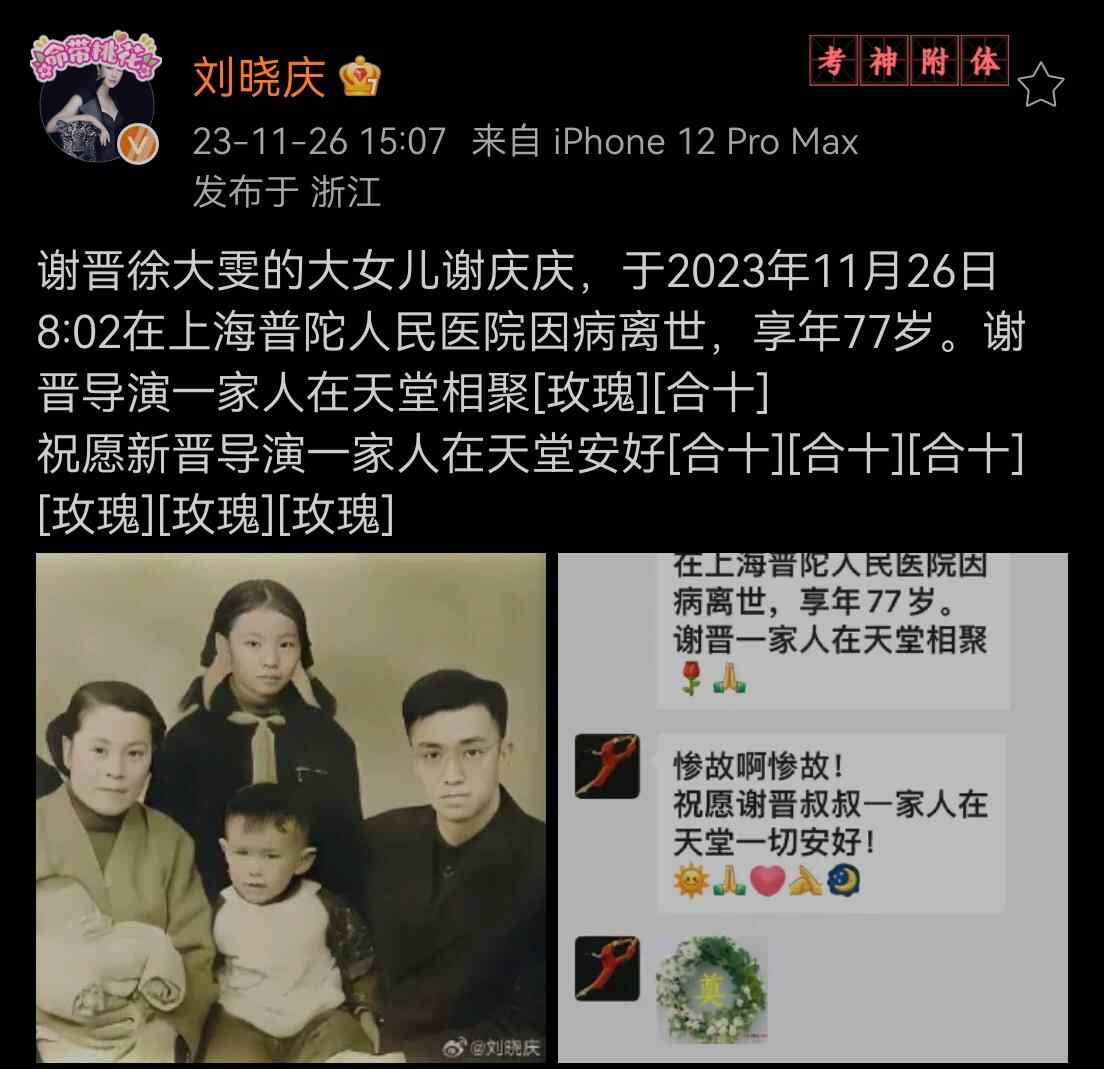 11月21日,是谢晋诞辰100周年。五天后的今(26)日,据刘晓庆发出消息,谢晋和徐大雯的大女儿谢庆庆,于今日上午八时在上海普陀人民医院因病离世,享年77岁。她写道“祝愿谢晋导演一家人在天堂安好”。