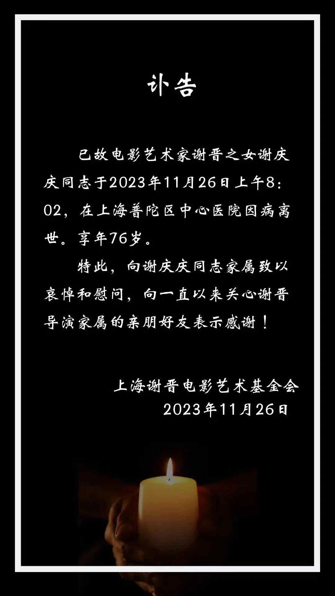 随后,上海谢晋电影艺术基金会发出讣告,证实谢庆庆去世消息。