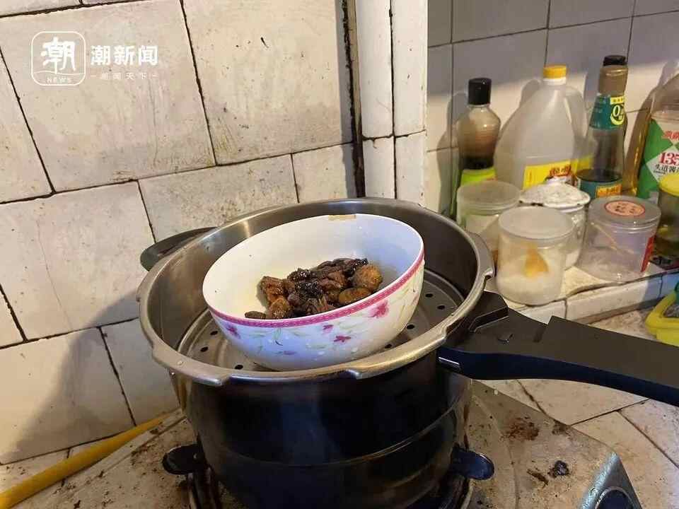 我们到的这天中午,他熟练地淘米上锅,再摆上一碗吃剩的板栗烧鸡。