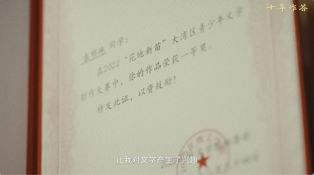 (02:04)袁明珠是一名初二学生,她的作文《拜读经典 筑梦湾区》曾获2022花地新苗(福田杯)作文大赛一等奖。她在小时候经常和妈妈玩故事接龙游戏,这使她爱上了写作。