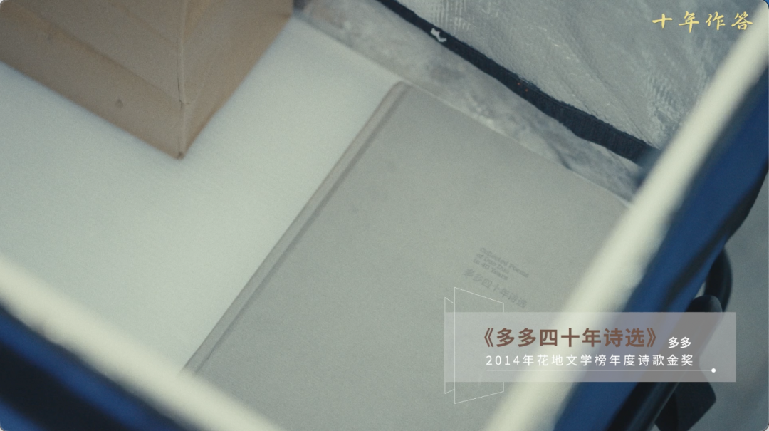 (00:32)外卖骑手外卖箱里的书籍为《多多四十年诗选》,曾获2014花地文学榜诗歌金奖。
