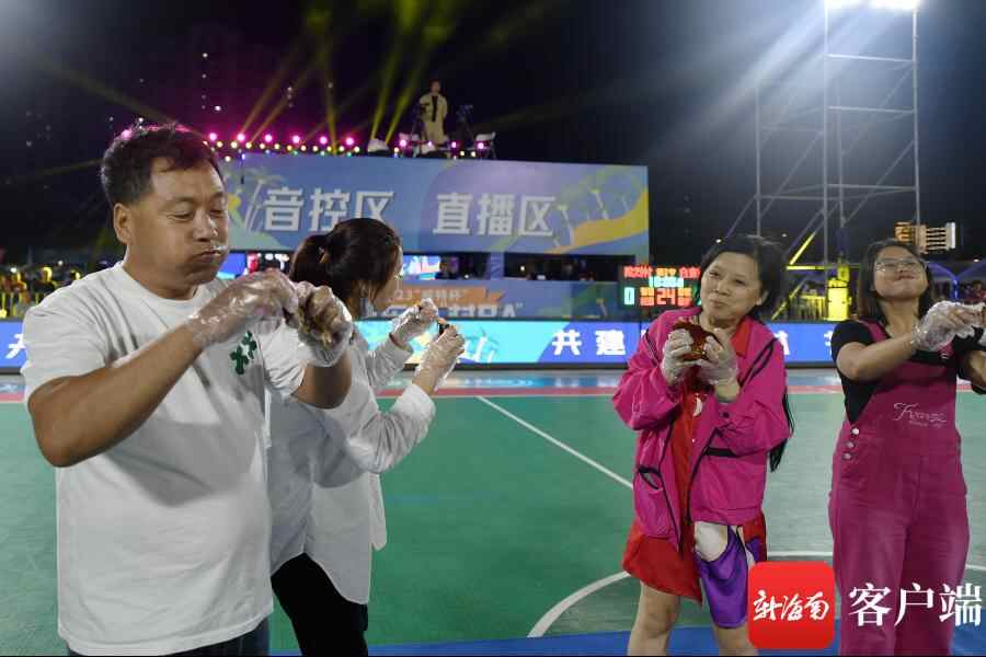外皮酥脆肉质鲜嫩的烤乳猪是东方的特色美食。当晚,在第二场比赛结束间隙,东方黄记四更烤乳猪店特地为“村BA”赞助一头烤乳猪举办“吃猪大赛”,将现场气氛再次推向高潮。6名幸运观众参赛,在规定时间内最先吃完一整块烤乳猪的参赛者斩获冠军。经过激烈的比拼,一位来自内蒙古的参赛者斩获冠军。“‘村BA’太带感啦,好看好玩又好吃,烤乳猪很香。”赛后,他为“村BA”点赞。