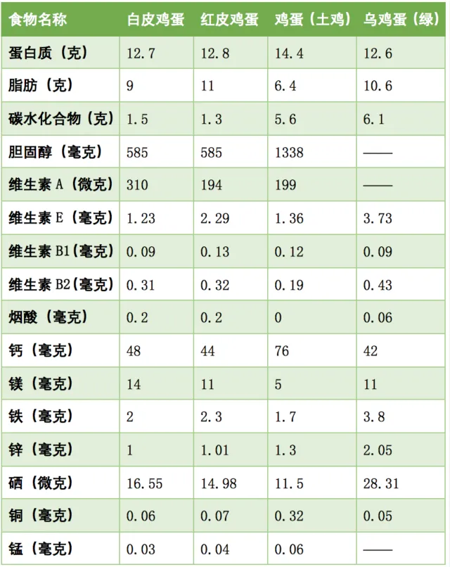 以笨鸡蛋和普通鸡蛋为例。《中国食物成分表》中土鸡蛋(即柴鸡蛋、笨鸡蛋)和洋鸡蛋的检测数据显示,相比洋鸡蛋,土鸡蛋的蛋白质、碳水化合物、胆固醇、钙、锌、铜、锰的含量略高一些,而脂肪、维生素A、维生素B2、烟酸、硒等含量略低,其他营养素差别不是很大。