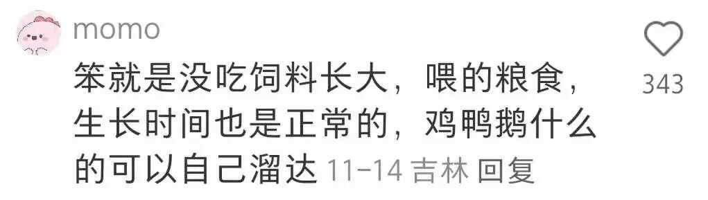 对于“笨”的含义,热心的东北网友也给出了解释:“笨”是指没吃饲料长大,喂的是粮食,生长时间是正常的,生长环境是可以自己溜达,因此笨鸡笨鸭在东北也可以叫溜达鸡、溜达鸭。
