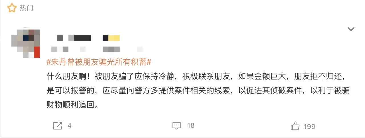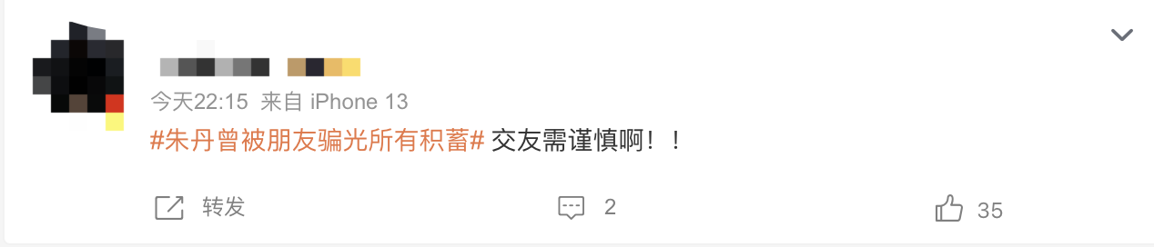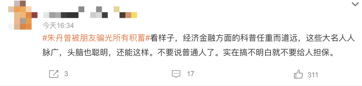 有网友在热搜#朱丹曾被朋友骗光所有积蓄#话题下评论:交友需谨慎!