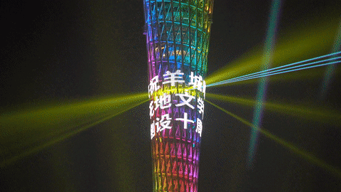 广州新中轴线花城广场光影交织,“庆祝羊城晚报花地文学榜创设10周年”祝福字样在广州塔端循环播放,吸引市民游客为之同欢,以文学点亮生活。