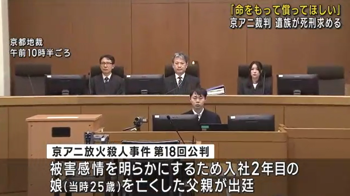 据日本读卖电视台11月29日报道,京都动画(京阿尼)纵火案被告青叶真司近期在京都地方法院接受公开审判。在29日的庭审中,纵火案受害者的亲属在进行意见陈述时表态,不需要被告道歉反省,只希望他偿命。