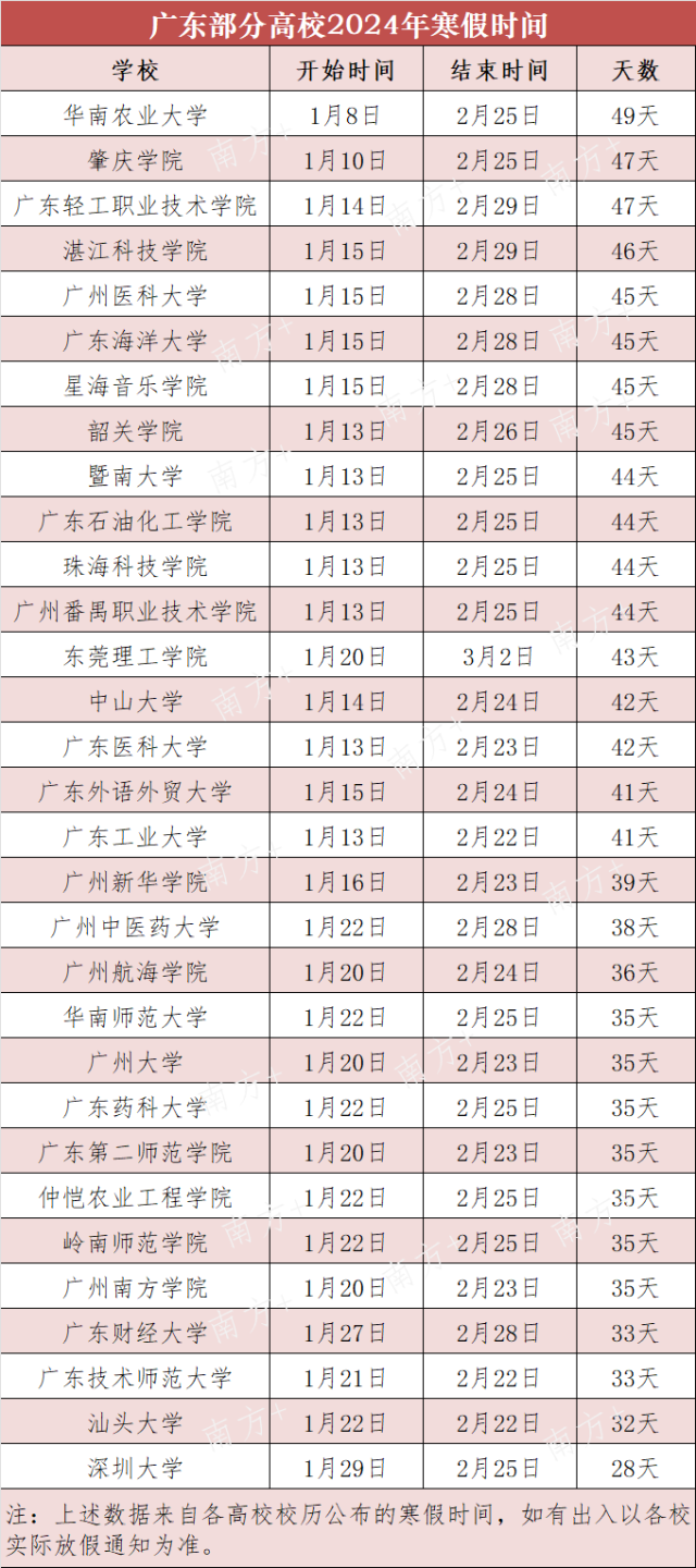 根据广东高校公布的校历,据不完全统计,大部分高校在2024年1月中旬放寒假,2月底开学,放假时间最长的有49天,最短的28天。