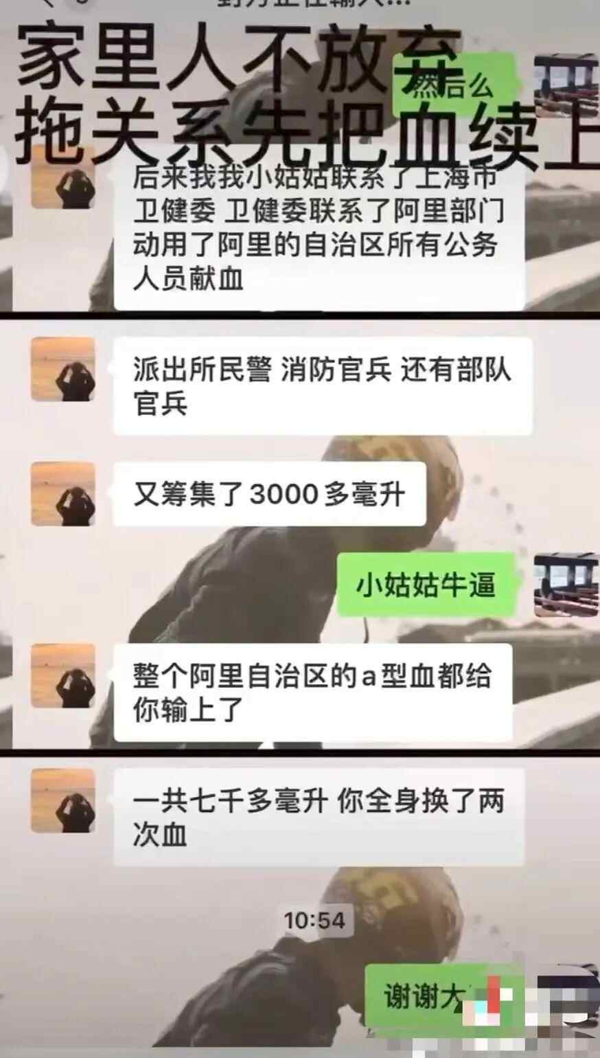 “阿里人口密度低,血库没有多少血,医院就为我们开通了绿色通道筹血——只要是生命垂危的老百姓,医院都会开通。”陶先生说,自己与妻子的户籍地都在上海,阿里地区医院和卫健委工作人员告诉他,当地医疗手段不高,医院在想办法,“你们也要自己想办法。”工作人员建议他们联系上海市卫健委,请援藏医生来支援。