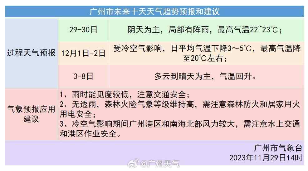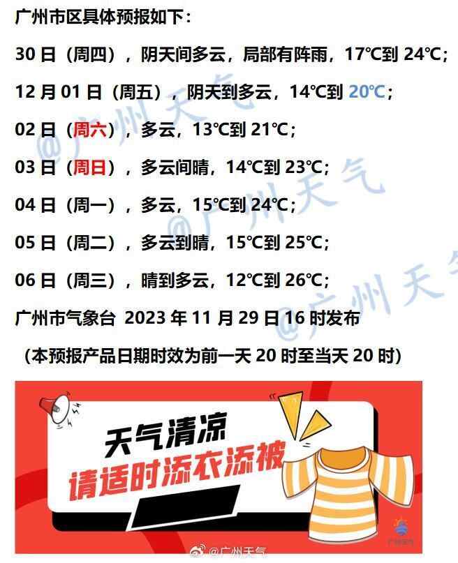 广州方面,11月最后一天的今天,新阿冷开始渗透,明天气温会再略降。不过不用太担心,10天内依然没有大降温,周末阳光会回归,洗晒出行都将可以安排。