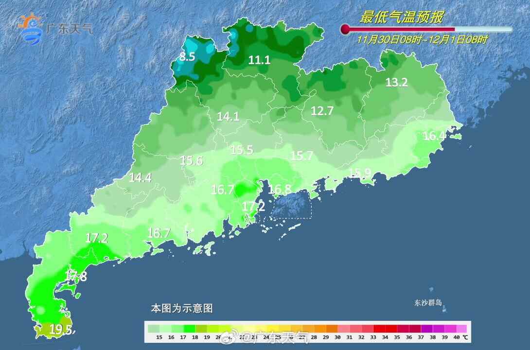 最低气温出现在后天(12月2日)早晨:粤北8-10℃,广州12℃左右,南部15℃左右。
