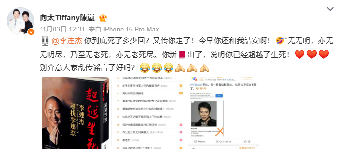 11月3日,“向太”陈岚发文否认李连杰去世的传闻。向太晒出多张截图写道:“@李连杰 你到底死了多少回?又传你走了……你新书出了,说明你已经超越了生死!别介意人家乱传谣言了好吗?”
