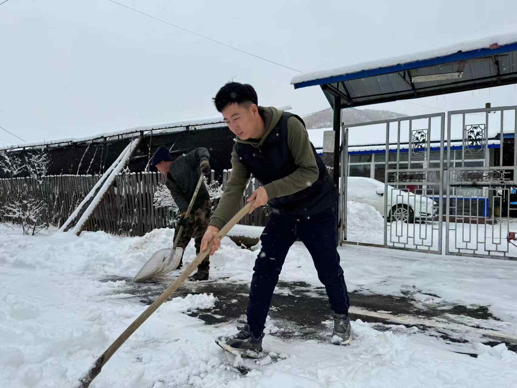 李建军父子俩在清扫家门口的积雪。人民网记者 曾帆摄