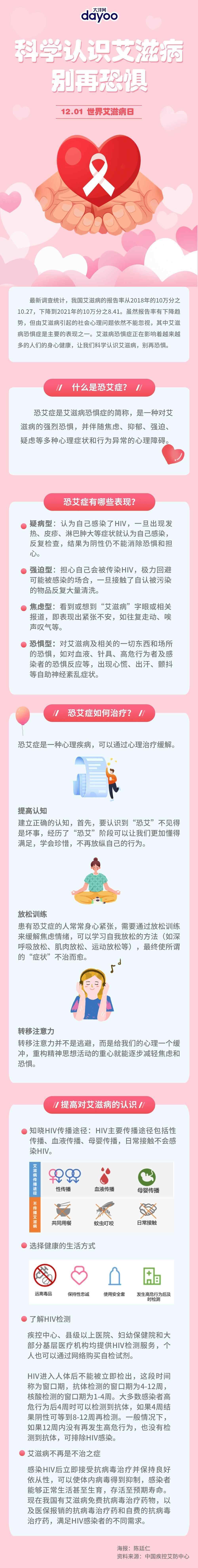 恐艾症也就是艾滋病恐惧症,是一种对艾滋病的强烈恐惧,并伴随焦虑、抑郁、强迫、疑病等多种心理症状和行为异常的心理障碍。患者怀疑自己感染了艾滋病病毒,或者非常害怕感染艾滋病并有洁癖等强迫症表现。这种恐惧完全出自自己的主观想象和联想。12月1日世界艾滋病日,让我们一起科学认识艾滋病,别再恐惧。