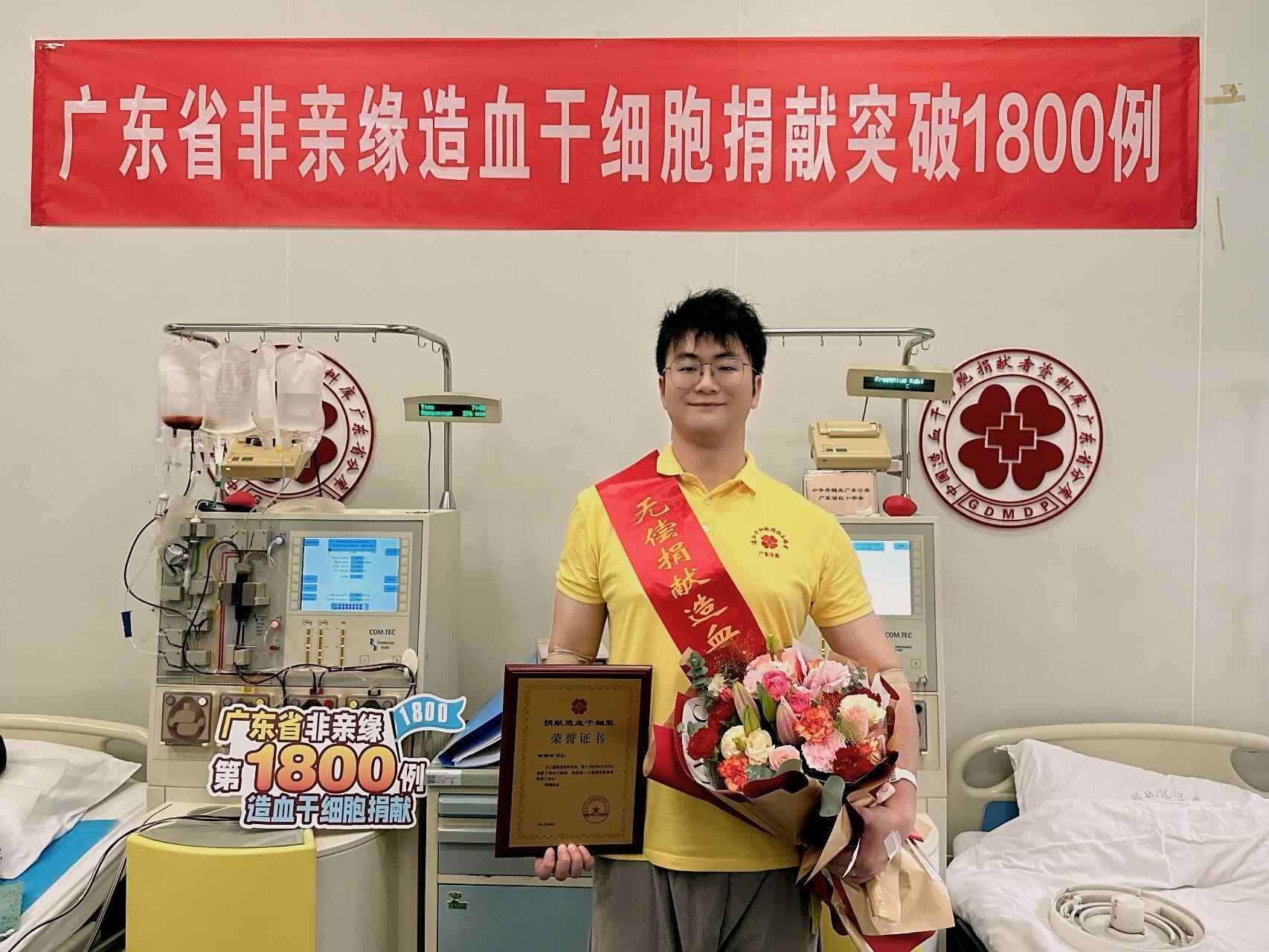 当天,志愿者谭先生成功捐献造血细胞,广东省非亲缘造血干细胞捐献在全国率先突破1800例。造血干细胞捐献者的大爱奉献为血液病患者送去了重生的希望。
