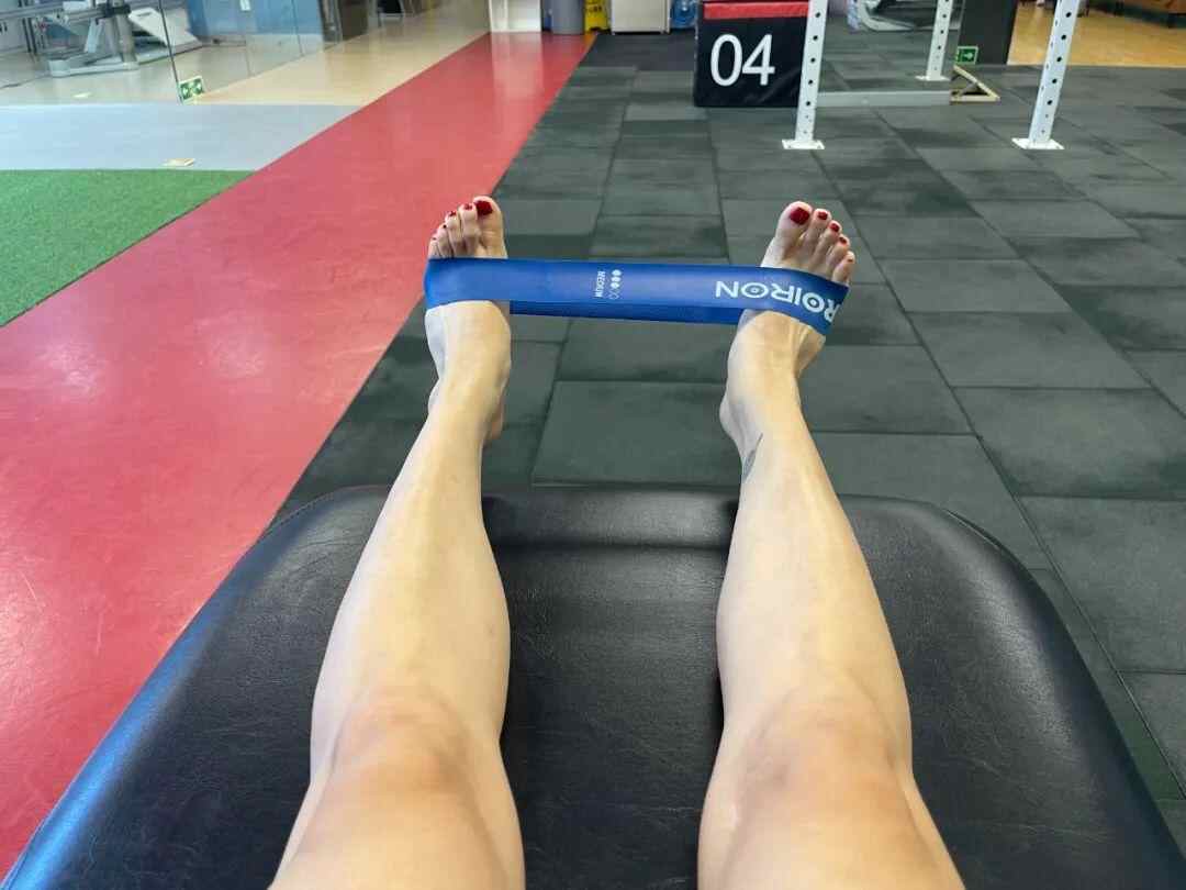 ②以训练右踝为目的。左侧固定在左踝,右侧套在右脚前部。