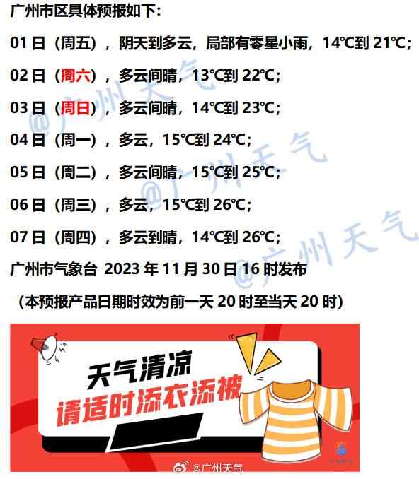 @广州天气预计,1日(周五),阴天到多云,局部有零星小雨,14°C到21°C:2日(周六),多云间睛,13°C到 22°C。