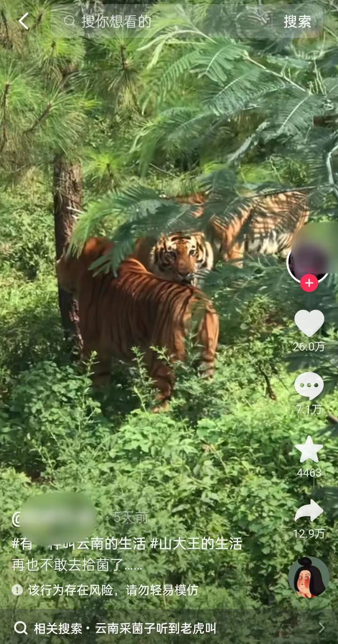 此前,也有网友在视频平台发布消息称,在云南省玉溪市峨山县上山捡菌遇到老虎打架。经查明,该男子发布的视频系2019年8月其在云南省昆明野生动物园所拍摄的,在该视频上标注“#有一种叫云南的生活#山大王的生活再也不敢去拾菌了……”的字样为虚假信息。
