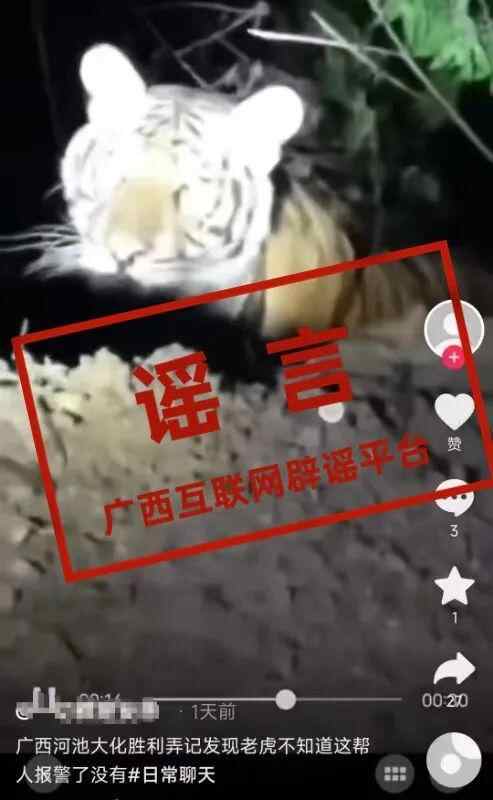 同样一段视频,有网友称是河池大化县发现了老虎。对此,大化县自然资源局及时发布辟谣声明,称网传信息不实。