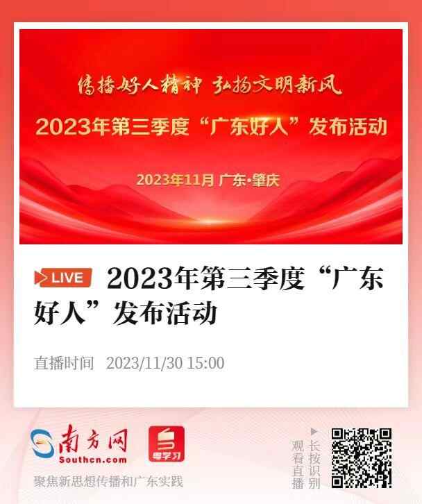 南方网讯(记者/陈伟峰)11月30日下午,2023年第三季度“广东好人”发布活动在肇庆艺术中心举行。本次活动由广东省精神文明建设委员会办公室主办,南方新闻网、中共肇庆市委宣传部、肇庆市精神文明建设委员会办公室、肇庆学院承办。