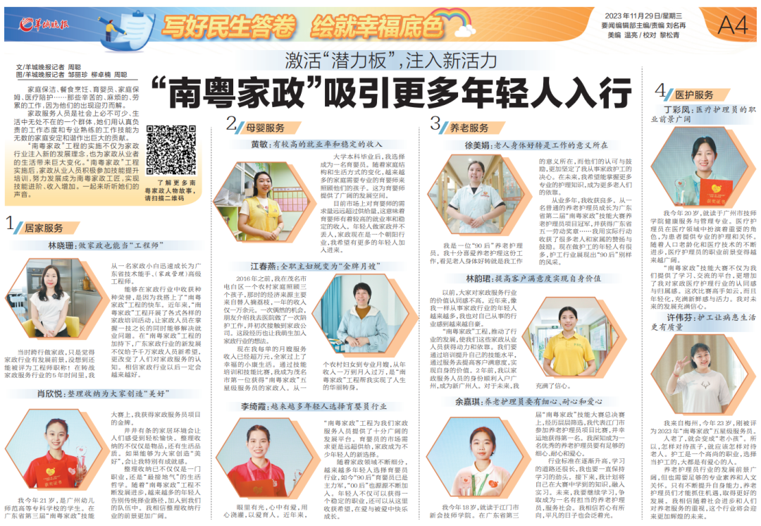 “南粤家政”工程的实施不仅为家政行业注入新的发展理念,也为家政从业者的生活带来巨大变化。“南粤家政”工程实施后,家政从业人员积极参加技能提升培训,努力发展成为南粤家政工匠,实现技能进阶、收入增加。一起来听听她们的声音。