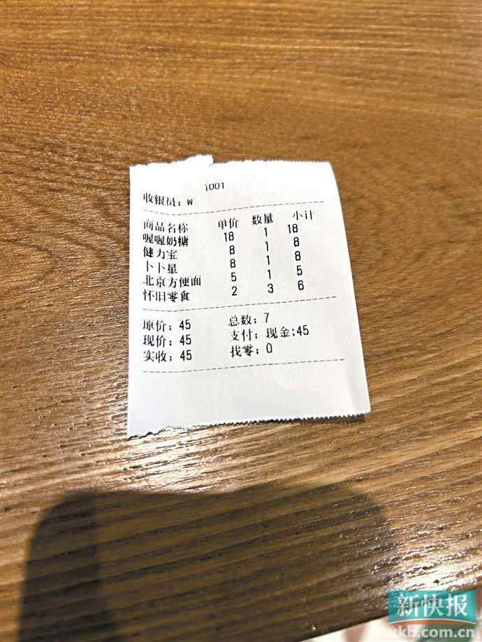 最后记者挑选7件商品进行结账,其中包括卜卜星、健力宝和一些小辣条,总共是45元。记者向服务员询问是否有购买凭证,服务员给出了小票。该小票上仅有模糊的商品名字、数量及价格,并没有具体的流水号、店家名称、商品货号、购买日期等信息。