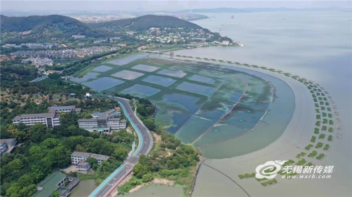 当天,记者随“种草”专家泛舟梅梁湖白旄村沿岸。放眼望去,湖湾被生态网膜和鱼簖“切割”成数个网格,外围铺设挡藻消浪的生态竹排,精心“呵护”水草生长环境。低头“绿草茵茵”,各类水生植物高低错落。“苦草爱抢地盘,一个夏季就蔓延一片,叶子像羽毛的是狐尾藻……”项目人员李王鑫如数家珍,说水草在生长中会吸收蓝藻喜食的“营养盐”,通过竞争相互遏制,不但减少氮磷还能覆盖底泥、减少鱼类对泥土扰动。他将水质监测仪投入湖中,数据显示区域内湖体总磷浓度比梅梁湖湖心低20%左右。很难想象,眼前水体透明度达80厘米、水生植物覆盖率达67%的湖湾,不久前还是一个清淤堆场。