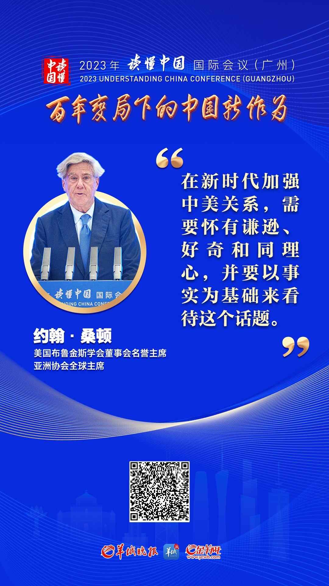 12月2日,2023年“读懂中国”国际会议在广州正式开幕。开幕式演讲中,美国布鲁金斯学会董事会名誉主席、亚洲协会全球主席约翰·桑顿畅谈美国普通老百姓眼中的中国人。他认为,要加强新时代中美关系,应多关注美国的青年人,用美国人能够听懂的话跟美国人打交道。