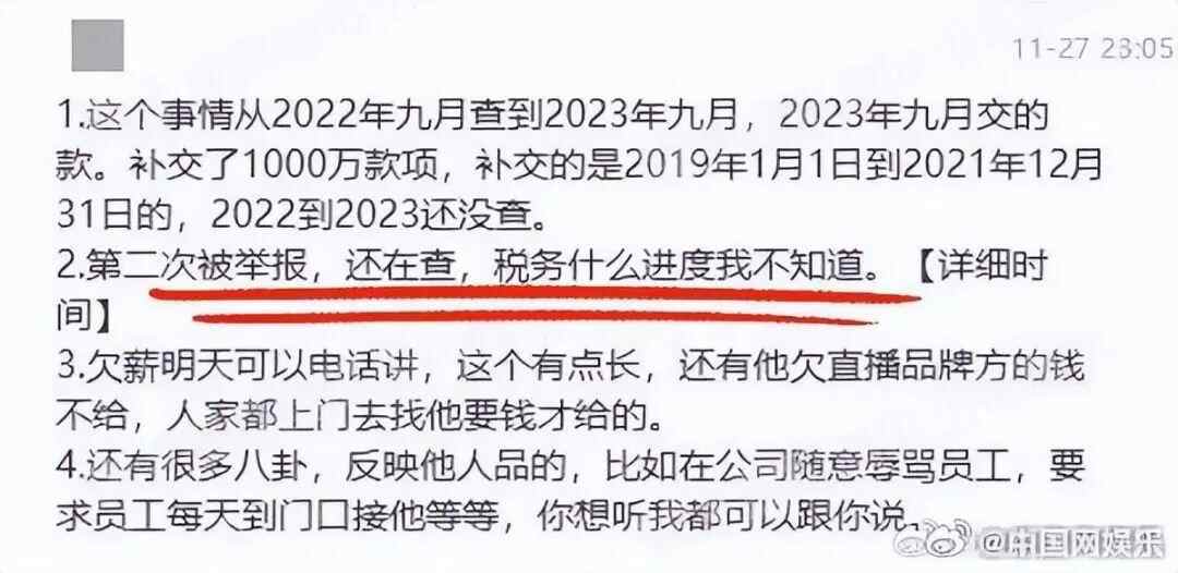 爆料人称,从2019年1月1日开始一直到2023年9月初,三年来陈志朋大概补缴税款1000多万元,2023年陈志朋也被税务机关缉查。该爆料人还称,在与陈志朋合作的两年时间内,陈志朋不和自己签劳动合同,违规解散公司后又拖欠爆料人赔偿金,拒绝开具离职证明。