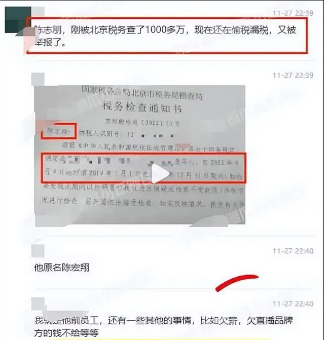 12月1日,有媒体爆料陈志朋疑似两次偷税漏税被查。该媒体称,陈志朋公司前员工对其表示,陈志朋在2019年至2021年期间疑似偷税漏税。