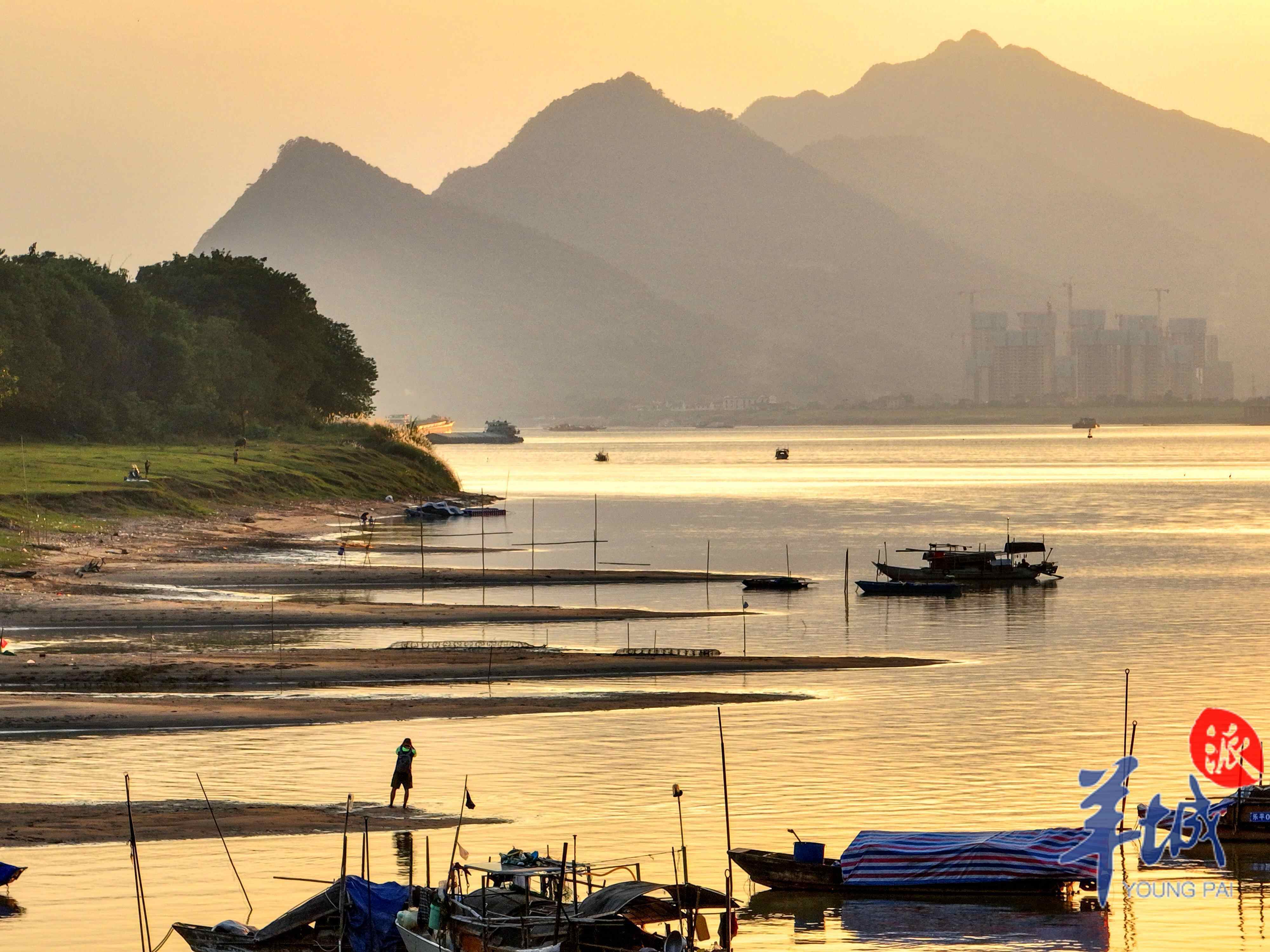晨光熹微,登高眺望砚洲岛,远峰如黛,还带着点点夜色。江水深沉而缓慢地流动着,三两船只带着红色灯火似落叶般随水而行,砚洲岛笼罩在淡淡的江雾中。