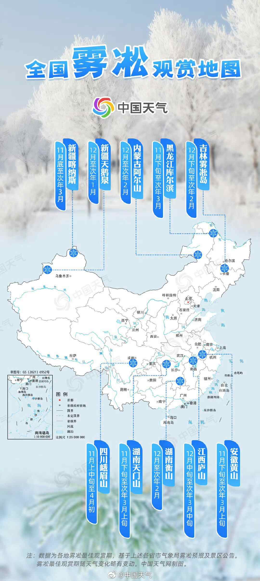 雾凇虽美,却可遇不可求,想要见到需要一定的运气。去哪儿才能成功邂逅一场最美雾凇呢?这张全国雾凇观赏地图,想看雾凇的广东老友看过来。有时间的话就出省去看雪、看雾凇吧!