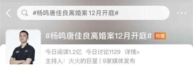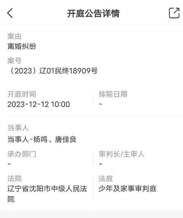 2023年2月17日,杨鸣再次因“离婚纠纷”起诉唐佳良。2023年12月12日,杨鸣与唐佳良离婚纠纷二审,将在沈阳市开庭。但从二人的声明来看,这段婚姻关系已经结束了。