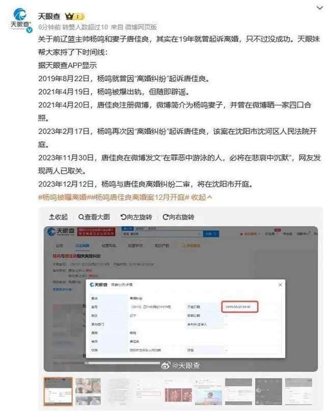 其实,今年8月,杨鸣便已卷入出轨风波,一度有传闻两人已提交了离婚申请。据天眼查APP显示,“关于前辽篮主帅杨鸣和妻子唐佳良,其实在2019年就曾起诉离婚,只不过没成功”。