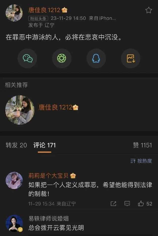 据报道,2023年11月29日,杨鸣妻子唐佳良在微博发文“在罪恶中游泳的人,必将在悲哀中沉默”。
