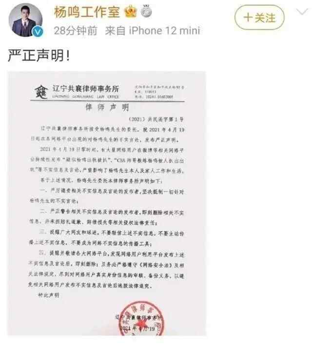 早在2021年杨鸣就曾被指出轨女网红,对此杨鸣工作室回应传闻为不实,杨鸣律师方发声明否认出轨。
