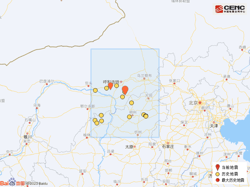历史地震:根据中国地震台网速报目录,震中周边200公里内近5年来发生3级以上地震共17次,最大地震是2022年12月12日在内蒙古呼和浩特市土默特左旗发生的4.1级地震(距离本次震中76公里),历史地震分布如图。